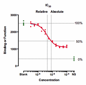 The relative IC50 is by far the most common definition, and the adjective relative is usually omitted. It is the concentration required to bring the curve down to point half way between the top and bottom plateaus of the curve. The NS values are totally ignored with this definition of IC50. This definition is the one upon which classical pharmacological analysis of agonist and antagonist interactions is based. With appropriate consideration of the biological system and concentrations of interacting ligands, estimated Kd values can often be derived from the IC50 value defined this way (not so for the "so-called absolute IC50" mentioned below).