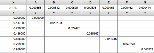 8.Continue with the rest of the data. You'll be entering data diagonally down the table. Since Prism can only have 104 columns, you will be limited to 104 data points, each with a Y value and two X values.