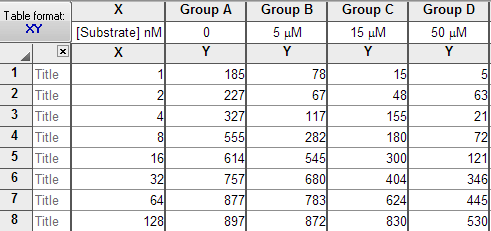 The substrate concentration is entered into the X column and the inhibitor concentration into the column titles.