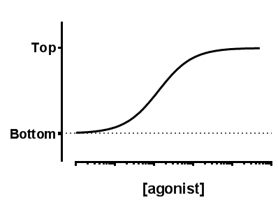 Many log(dose) response curves follow the familiar symmetrical sigmoidal shape. The goal is to determine the EC50 of the agonist - the concentration that provokes a response half way between the basal (Bottom) response and the maximal (Top) response.