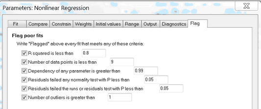 In the Flag tab, define the attributes that define poor fits you wish to flag. You can choose to flag a fit with any or all of the following attributes: low R2, too few data points, too high a dependency for any parameter, a failed normality test of residuals, a failed runs or residual test, or too many outliers.