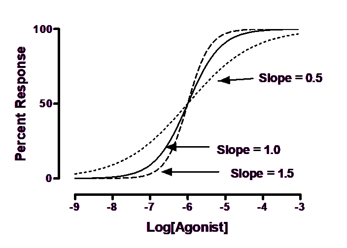 Some dose-response curves are steeper or shallower than the standard curve. The steepness is quantified by the Hill slope, also called a slope factor. A dose-response curve with a standard slope has a Hill slope of 1.0. A steeper curve has a higher slope factor, and a shallower curve has a lower slope factor.