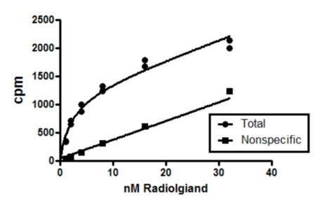 This experiment measured equilibrium binding of radioligand at various concentrations of radioligand to find the Bmax and Kd of the radioligand. Since the ligand binds to nonspecific sites as well as the receptor of interest, the experiment measured both total binding and nonspecific binding (binding of radioligand in the presence of an excess of an unlabeled receptor blocker).