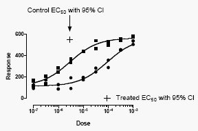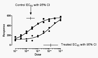 While the curves nicely fit the data points, the confidence intervals are quite wide. We really haven't determined the EC50 with sufficient precision to make useful conclusions. The problem is that the control data (squares) don’t really define the bottom plateau of the curve, and the treated data (circles) don’t really define the top plateau of the curve. Since the data don’t define the minimum and maximum responses very well, the data also don’t define very clearly the point half-way between the minimum and maximum responses. Accordingly, the confidence intervals for each EC50 extend over more than an order of magnitude. The whole point of the experiment was to determine the two EC50 values, but there is an unacceptable amount of uncertainty in the value of the best-fit values of the EC50.