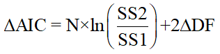 The equation now makes intuitive sense. Like the F test, it balances the change in goodness-of-fit as assessed by sum-of-squares with the change in the number of degrees of freedom (due to differences in the number of parameters to be fit). Since model 1 is the simpler model, it will almost always fit worse, so SS1 will be greater than SS2. Since the logarithm of a fraction is always negative, the first term will be negative. Model 1 has fewer parameters and so has more degrees of freedom, making the last term positive. If the net result is negative, that means that the difference in sum-of-squares is more than expected based on the difference in number of parameters, so you conclude that the more complicated model is more likely.