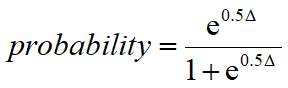From the difference in AICc values, Prism calculates and reports the probability that each model is correct, with the probabilities summing to 100%. If one model is much more likely to be correct than the other (say, 1% vs. 99%), you will want to choose it. If the difference in likelihood is not very big (say, 40% vs. 60%), you will know that either model might be correct, so will want to collect more data. These probabilities are computed with this equation, where Δ is the difference between the AICc values.