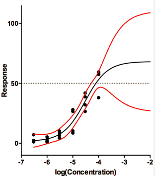 In other cases, the bottom confidence band bends downwards, so the upper confidence limit of the interpolated value is simply undefined. The figure below shows one such example. It doesn't matter how far you extend the X axis, the upper confidence limit of the interpolated value is simply not defined by the data. The dotted horizontal line at Y=50 will never intersect the lower of the confidence bands. The only fix would be to collect data at higher X concentrations, or perhaps more precise Y values.