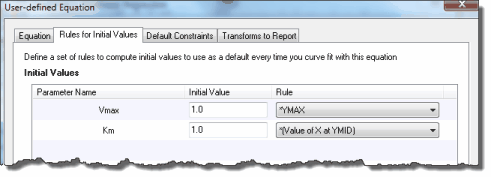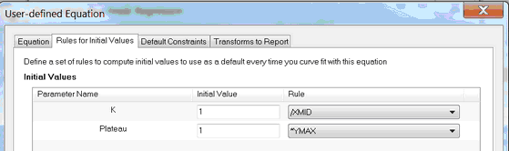 •On the Rules for initial values tab in the dialog that defines an equation, set the initial value of a parameter to equal the mean of those column titles. Or to the logarithm of that mean.