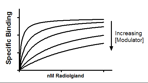 An allosteric modulator can reduce radioligand binding. This model fits experiments, where entire radioligand binding curves are measured in the absence and presence of modulator. The goal is to learn the affinity of the modulator for binding to its site, and also determine the value of alpha, the ternary complex constant that quantifies the degree to which binding of the modulator alters the affinity of the radioligand for the receptor site.