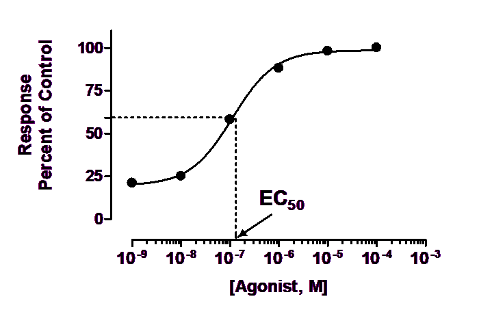 Don't over interpret the EC50. It is simply the concentration of agonist required to provoke a response halfway between the baseline and maximum responses. Because the EC50 defines the location of the dose-response curve for a particular drug, it is the most commonly used measure of an agonist’s potency. However, the EC50 is usually not the same as the Kd for the binding of agonist to its receptor -- it is not a direct measure of drug affinity.