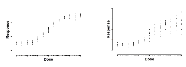 Both graphs above show dose-response curves, with response measured in ten replicate values at each response. In the left graph, the standard deviation of those replicates is consistent. It is about the same all the way along the curve. In the right graph, the standard deviation of the replicates is related to the value of Y. As the curve goes up, variation among replicates increases.