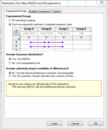 Prism offers four related tests that compare three or more groups. Your choice of a test depends on these choices: