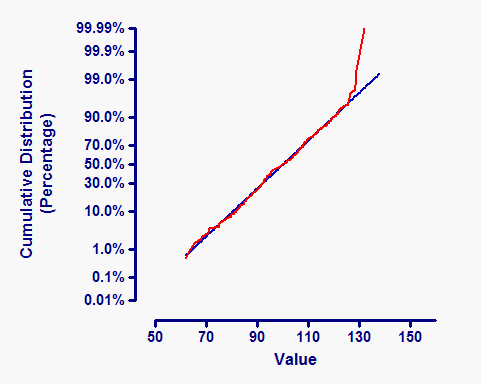 Below, the same graph is plotted using a probability Y axis. To do this, double-click on the Y axis to bring up the Format Axis dialog, drop down the choices for scale in the upper right corner, and choose "Probability (0..100%). The cumulative Gaussian distribution is linear when plotted on probability axes. At the top right of the graph, the cumulative distribution is a bit higher than predicted by a Gaussian distribution. This discrepancy is greatly exaggerated when you plot on a probability axis.
