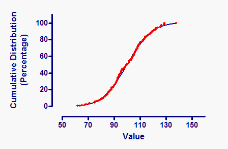 Prism can superimpose a cumulative Gaussian distribution over a graph of the cumulative distribution of the data. The cumulative Gaussian distribution has a sigmoidal shape.