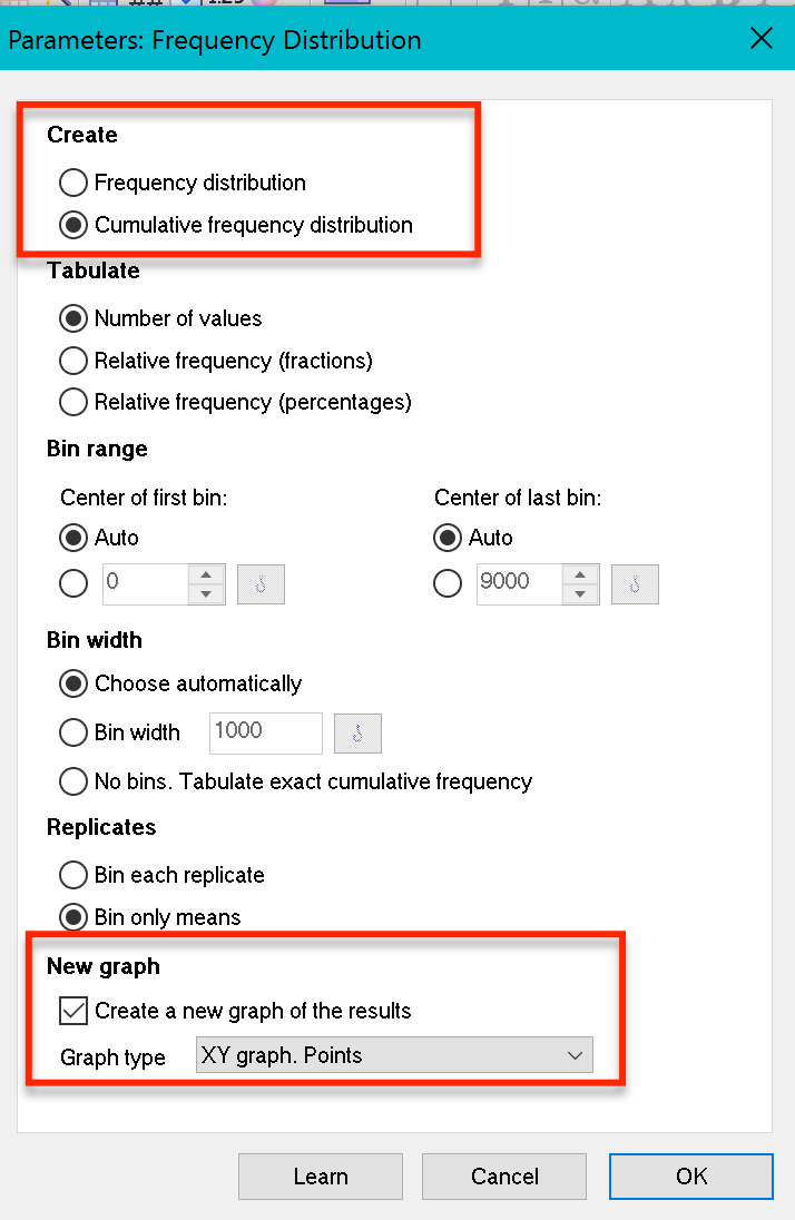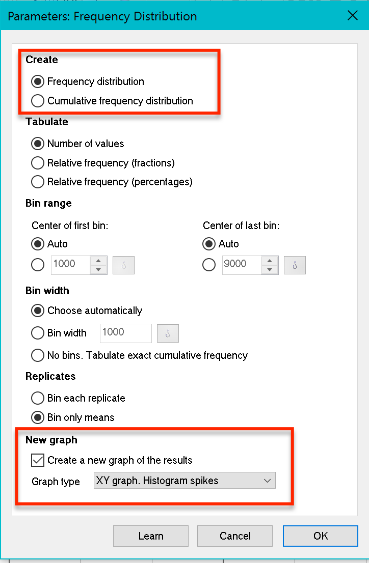 1.In the frequency distribution dialog, choose to create the frequency distribution (not a cumulative distribution). Also choose to plot the data as an XY graph of histogram spikes.
