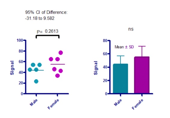 The graphs above plot the sample data for an unpaired t test. We prefer the graph on the left which shows each individual data point. This shows more detail, and is easier to interpret, than the bar graph on the right.