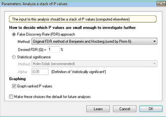 Choose one of two general approaches:Control the False Discovery Rate (FDR) or control the Type I error rate for the family of comparisons. Then choose the actual method you want Prism to use.