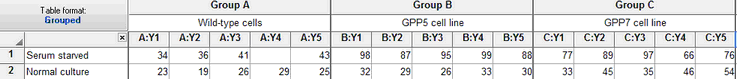 In the example above, the two rows encode the two levels of one factor (serum starved vs. normal culture) and the three data set columns encode the three levels of the other factor (cell line).