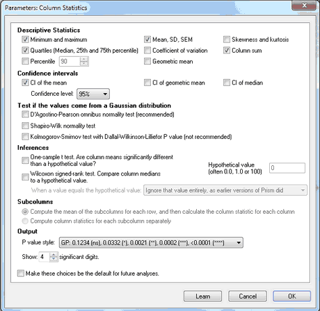 The choices for subcolumn will not be available when you analyze data entered on table formatted for column data, which have no subcolumns. If your data are on a table formatted for XY or grouped data with subcolumns, choose to compute column statistics for each subcolumn individually or to average the subcolumns and compute columns statistics on the means.