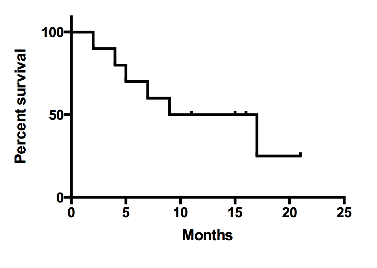•If the survival curve is horizontal at 50% survival, then the median survival time is not really defined. In the survival curve below, the curve is horizontal at Y=50% between 9 and 17 months. It would be accurate to say that half the patients had died by 9 months, or that half were still alive at 17 months. Prism follows the suggestion of Machin and reports that the median survival is the average of those two values, 13 months.