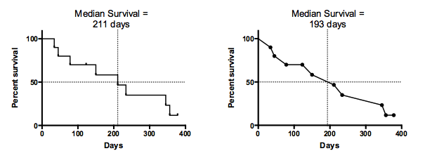 •Prism, like most programs, defines median survival as the time at which the staircase survival curve crosses 50% survival. Thus is is an accurate statement of median survival in the subjects or animals actually included in the data set. The graph on the left below, shows how Prism computes median survival (211 days for this example). If you connected the survival times with point-to-point lines rather than a staircase, you'd find that the line may intersect Y=50% at an earlier time, and thus you'd come up with a different value for median survival (193 days in the example on the right below) This would make sense if you were trying to predict median survival for future patients. Prism does not do this, as it is not standard.