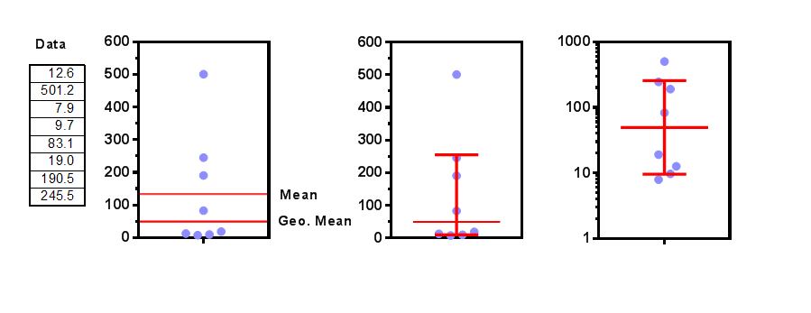 The example above shows eight values (so you can do the calculations yourself, if you want to). The geometric mean is 49.55 and the geometric SD factor is 5.15. The left graph shows the data with lines denoting the mean and geometric mean. The middle graph shows how Prism plots the geometric mean and geometric SD. The upper error bar extends up to the geometric mean times the geometric SD factor (49.55 * 5.15 = 255.2). The lower error bars extends down to the geometric mean divided by the geometric SD factor (49.55 / 5.15 = 9.62). The right graph shows the data, the geometric mean, and the geometric SD plotted on a logarithmic axis. The log SD error bars appear visually symmetrical on a log axis, even though numerically they are very asymmetrical.