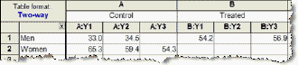 The following table cannot be analyzed by two-way ANOVA because there are no data for treated women. Since this example will be analyzed by ordinary two-way ANOVA, it doesn't matter much that there are only two (not three) replicates for control men and treated men. When you want to use repeated-measures ANOVA, missing values are not allowed.