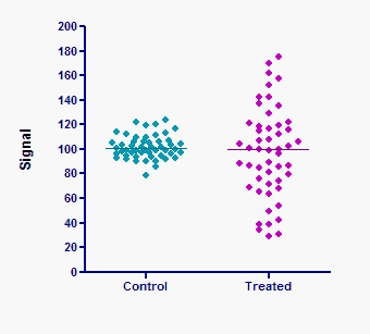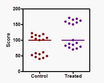 The graph shows each value obtained from control and treated subjects. The two-tail P value from the Mann-Whitney test is 0.0288, so you conclude that there is a statistically significant difference between the groups. But the two medians, shown by the horizontal lines, are identical. The Mann-Whitney test ranked all the values from low to high, and then compared the mean ranks. The mean of the ranks of the control values is much lower than the mean of the ranks of the treated values, so the P value is small, even though the medians of the two groups are identical.