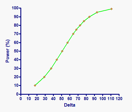 •Hey, this is hypertension. Nothing is simple. No effects are large. We've got to follow every lead we can. It would be nice to find differences of 50% (see above) but realistically, given the heterogeneity of hypertension, we can't expect to find such a large difference. Even if the difference was only 20%, we'd still want to do follow up experiments. Since the mean number of receptors per platelet is 260, this means we would want to find a difference of about 50 receptors per platelet. Reading off the graph (or the table), you can see that the power of this experiment to find a difference of 50 receptors per cell was only about 50%. This means that even if there really were a difference this large, this particular experiment (given its sample size and scatter) had only a 50% chance of finding a statistically significant result. With such low power, we really can't conclude very much from this experiment. A reviewer or editor making such an argument could convincingly argue that there is no point publishing negative data with such low power to detect a biologically interesting result.