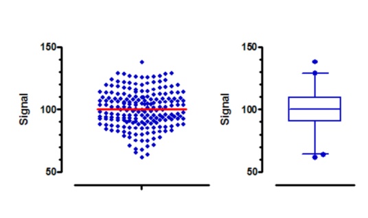 In many cases, plotting a column scatter graph is all you need to do to see the distribution of data. The graph on the left is a column scatter plot (with line drawn at the mean) made from the "Frequency distribution" sample data. The graph on the right is a box-and-whiskers graph of the same data, showing the values lower than the first percentile and greater than the 99th percentile as circles. Note that Prism offers several choices for how to define the whiskers in this kind of plot.