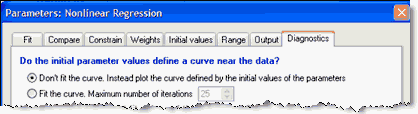 The top of the Diagnostics tab offers the choice to plot the curve defined by the initial values of the parameters.