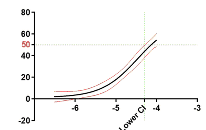 In some cases, the bottom confidence band bends downwards, so the upper confidence limit of the interpolated value is simply undefined. The figure below shows one such example. It doesn't matter how far you extend the X axis, the upper confidence limit of the interpolated value is simply not defined by the data. The dotted horizontal line at Y=50 will never intersect the lower of the confidence bands. The only fix would be to collect data at higher X concentrations, or perhaps more precise Y values.