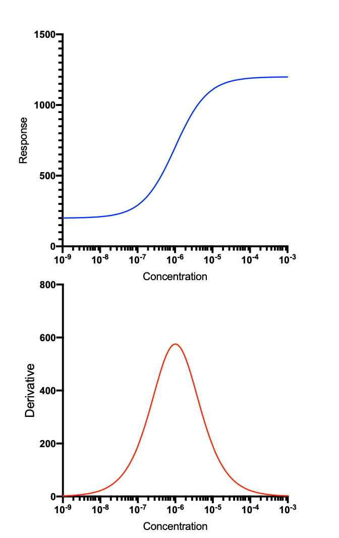 •There is no clear definition of a "linear range". Any such definition is arbitrary. The graph below shows an ideal log(concentration) vs. response curve. It looks like there is a "linear range" in the middle of the curve. But the lower graph shows the derivative (slope) of the curve. If there were a linear part of the curve, the derivative curve would be flat (horizontal) where the slope of the curve doesn't change (because it is "linear"). Because there is no flat portion of the derivative curve, any definition of "linear portion" would be arbitrary.