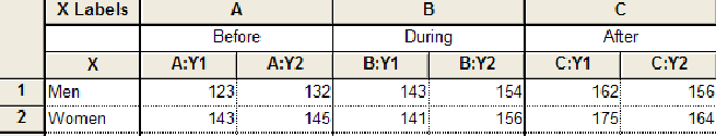 The ANOVA results will be identical no matter which way you enter the data. But the choice defines how the graph will appear. If you enter data as shown in the first approach above, men and women will appear in bars of different color, with three bars of each color representing the three time points (left graph below). If you enter data using the second approach shown above, there will be one bar color and fill for Before, another for During, and another for After (right graph below). Men and Women appear as two bars of identical appearance.