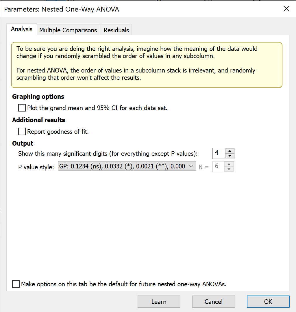 •Prism cannot run nested ANOVA with huge data sets and presents an message telling you so. How huge is huge? Details here