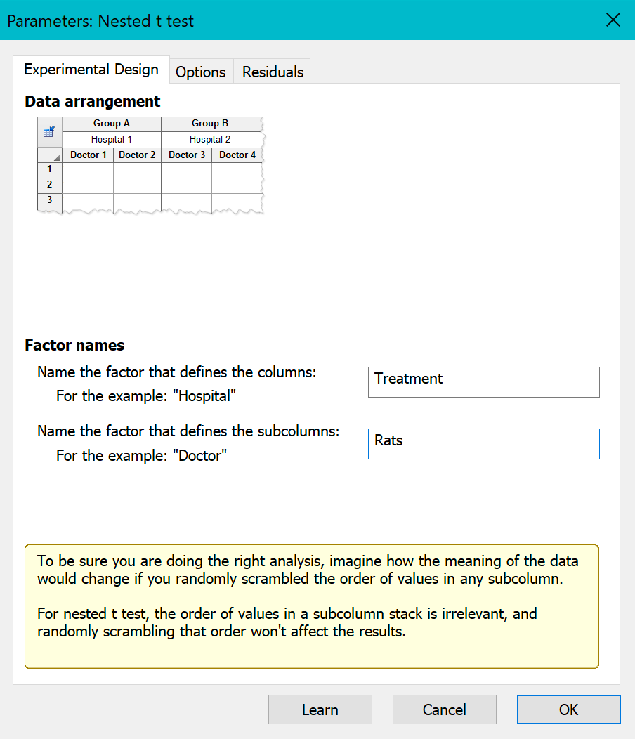 •The term "technical replicates" may not always apply. If you are studying three hospitals in each group, with four doctors in each hospital, stack the information for each hospital in a subcolumn, with each doctor on a different row.