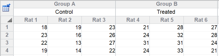 You measure a variable in control and treated rats. There were three rats in each group, and you measured four technical replicates in each rat. Note that the four values stacked in each subcolumn are in arbitrary order. There is no time course or any other meaning to order of the four rows.
