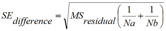 •The standard error of the difference is computed. The equation below is used where MSresidual is the mean square of the residuals reported in the ANOVA table, and Na and Nb are the two sample sizes. If row 1 has four columns and entry of data in triplicate with one missing value, Na would equal 11. When there are missing values, the computation of the SEdifference is more complicated.