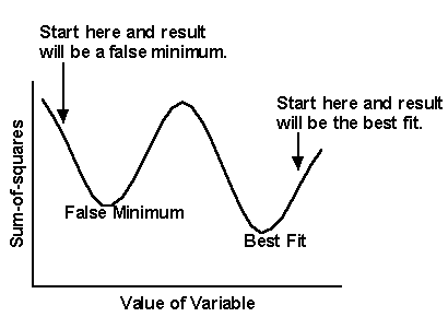 Think of latitude and longitude as representing two variables Prism is trying to fit. Now think of altitude as the sum-of-squares. Nonlinear regression works iteratively to reduce the sum-of-squares. This is like walking downhill to find the bottom of the valley. When nonlinear regression has converged, changing any variable increases the sum-of-squares. When you are at the bottom of the valley, every direction leads uphill. But there may be a much deeper valley over the ridge that you are unaware of. In nonlinear regression, large changes in variables might decrease the sum-of-squares.