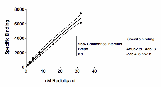 The figure above shows a saturation binding equation fit to specific binding data. But all the concentrations are relatively low (compared to the Kd of binding) so the data almost form a straight line. The saturation binding model fits the data fine (solid curve), with a narrow 95% confidence band around the curve (dashed lines). But look at the confidence interval for Bmax and Kd (shown in the box)! They are super wide, even descending into negative (impossible) values. With these data, the curve fit the data fine, but neither parameter in the model (Bmax and Kd) were fit with reasonable confidence intervals. This is no surprise. The data don’t show even a hint of plateauing, so the data simply don’t define the Bmax and Kd at all.