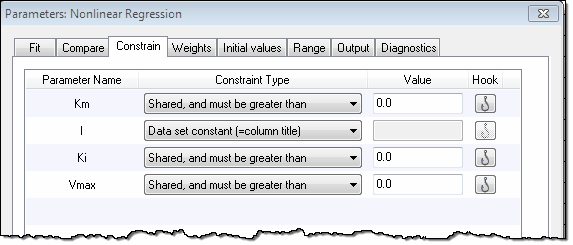 •In the constraints tab, define that parameter to be a data set constant equal to the column title. You don't want Prism to fit that parameter, but rather to get its value from the column titles.