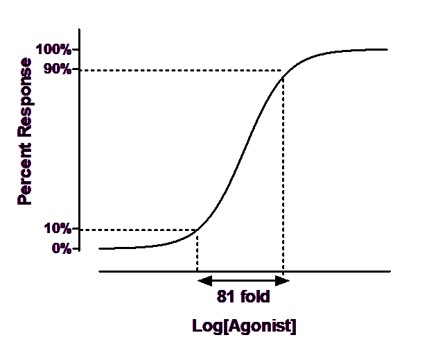 Many dose-response curves follow the shape of a receptor binding curve. As shown below, 81 times more agonist is needed to achieve 90% response than a 10% response.