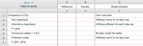 Prism names the null and alternative hypotheses, and reports the P value. You set the threshold P value in the Compare tab of the nonlinear regression dialog. If the P value is less than that threshold, Prism chooses (and plots) the alternative (more complicated) model. It also reports the value of F and the numbers of degrees of freedom, but these will be useful only if you want to compare Prism's results with those of another program or hand calculations.