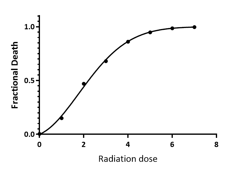 Create an XY table. Enter radiation doses into X and fraction dead cells into Y. After entering data, click Analyze, choose nonlinear regression, choose the panel of linear-quadratic equations, and choose Linear quadratic: Y is fraction dead.