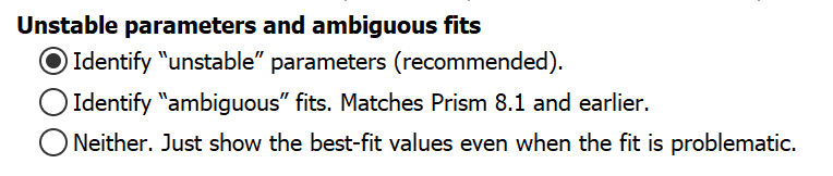 Note that while the designation of "ambiguous" applies to an entire fit, the label "unstable" is applied to one or more parameters. For those that want to know more of the details, read about how Prism identifies unstable parameters.