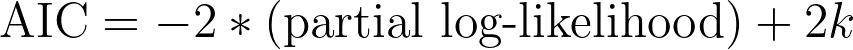 The partial log-likelihood for a Cox regression model is simply the logarithm of the partial likelihood. As mentioned above, models which the data fit well will have higher likelihoods than models which the data do not fit well. Thus, the partial log-likelihoods for models which the data fit well will also be larger than the partial log-likelihood for models which the data fit less well. By multiplying this value by a negative value, we can see that models which the data fit better will result in a smaller value for "-2*(partial log-likelihood)" than models which the data fit less well. Thus, we can see that a larger likelihood ultimately results in a smaller AIC (ignoring the 2k term which will be discussed shortly). So it makes sense that a smaller AIC represents a "better" model fit.