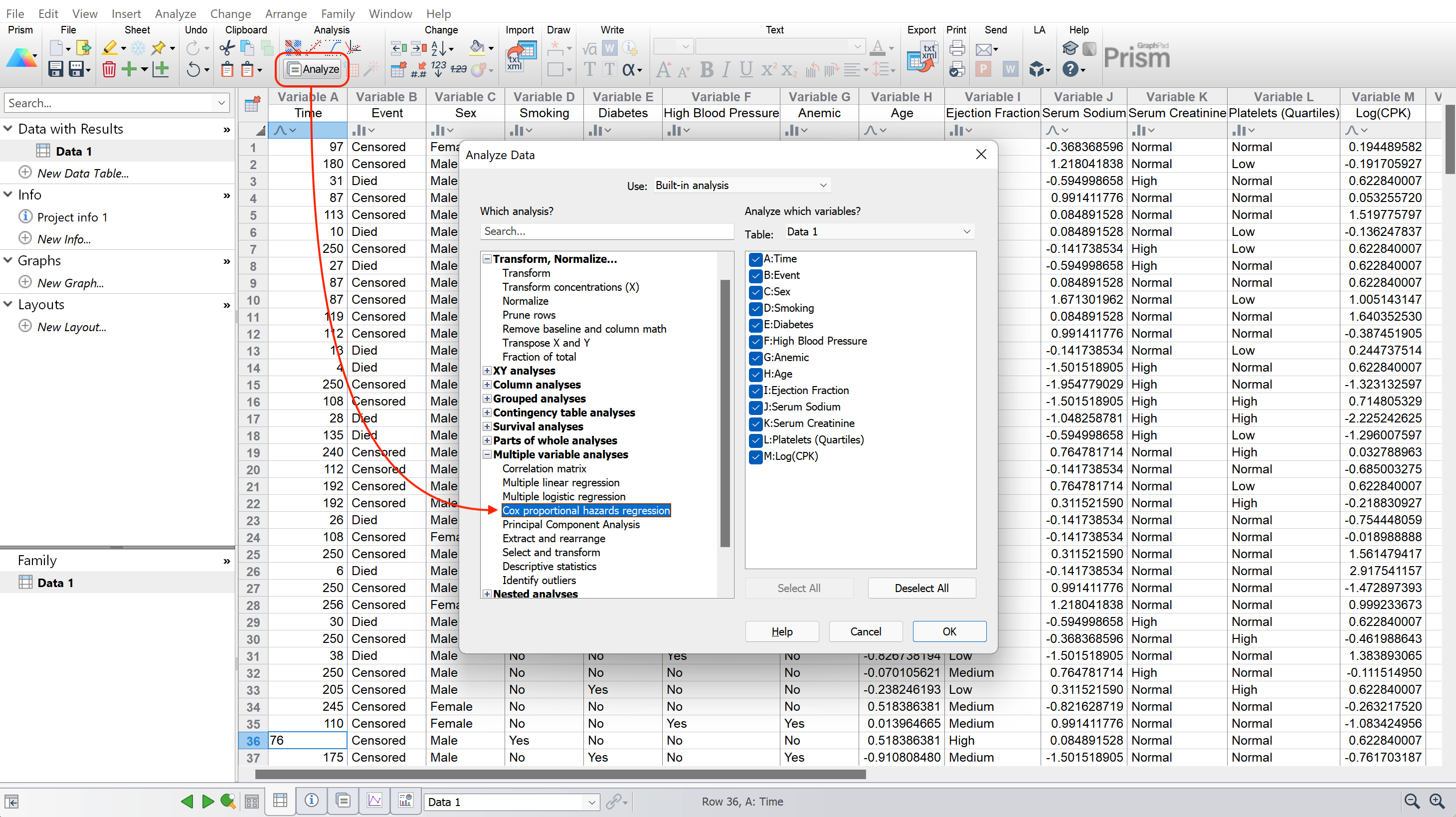 To start the analysis, click on the Analyze button in the “Analysis” section of the Toolbar, then select “Cox proportional hazards regression” from the list of available Multiple variable analyses. Alternatively, you can use the Analyze menu, and find “Cox proportional hazards regression” listed either under “Regression and curves” or “Survival analysis”.