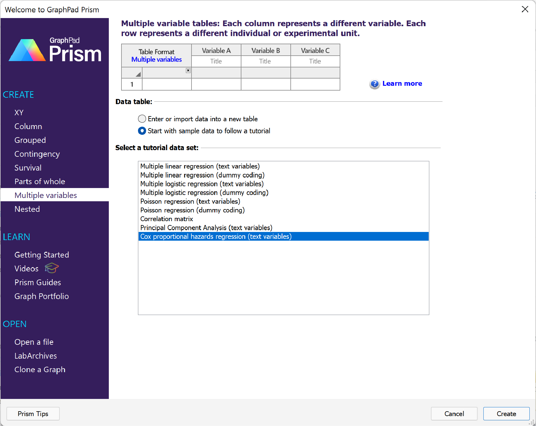 After selecting the analysis, the parameters dialog will appear. For the purposes of this example, we’re going to accept most of the default options that Prism provides. The results for the options selected here will be discussed briefly, but there are many more options available on each of the different tabs in the Parameters: Multiple Cox Regression dialog.