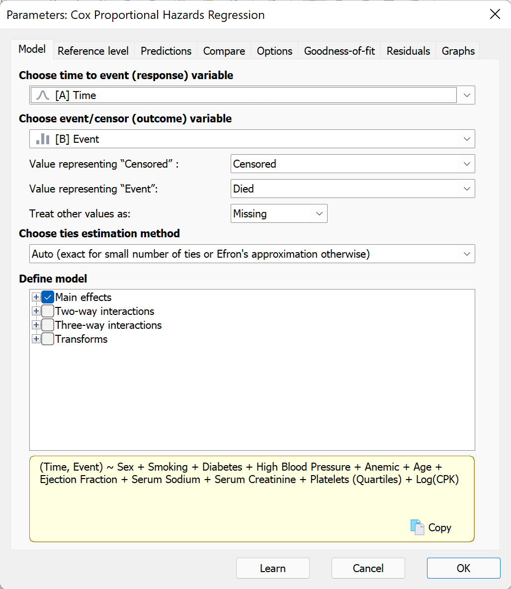 On the model tab of the dialog (shown above), you can see that Prism has already selected variables for the time to event (response) and outcome (event/censor) variables. Additionally, since the outcome variable (Event) was a categorical variable, we should verify that the correct levels were assigned to “Value representing ‘Censored’” and “Value representing ‘Event’”. In this case, these are also both correct. Expanding the “Main effects” section in “Define model” you can see that all predictor variables are included by default in the model (this is confirmed in the yellow text box at the bottom of the tab which provides a simple representation of the model to be performed).