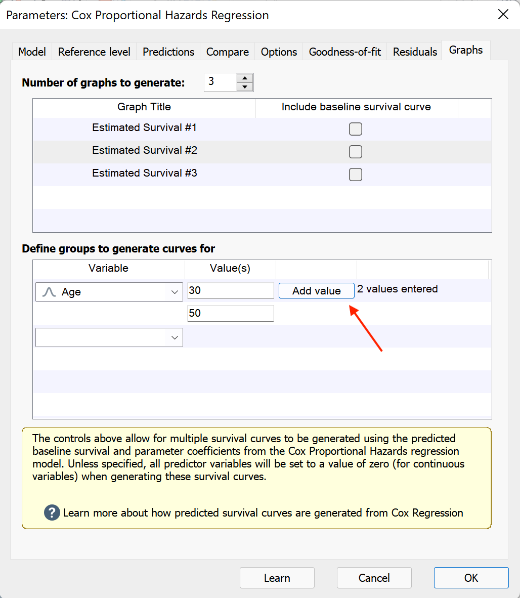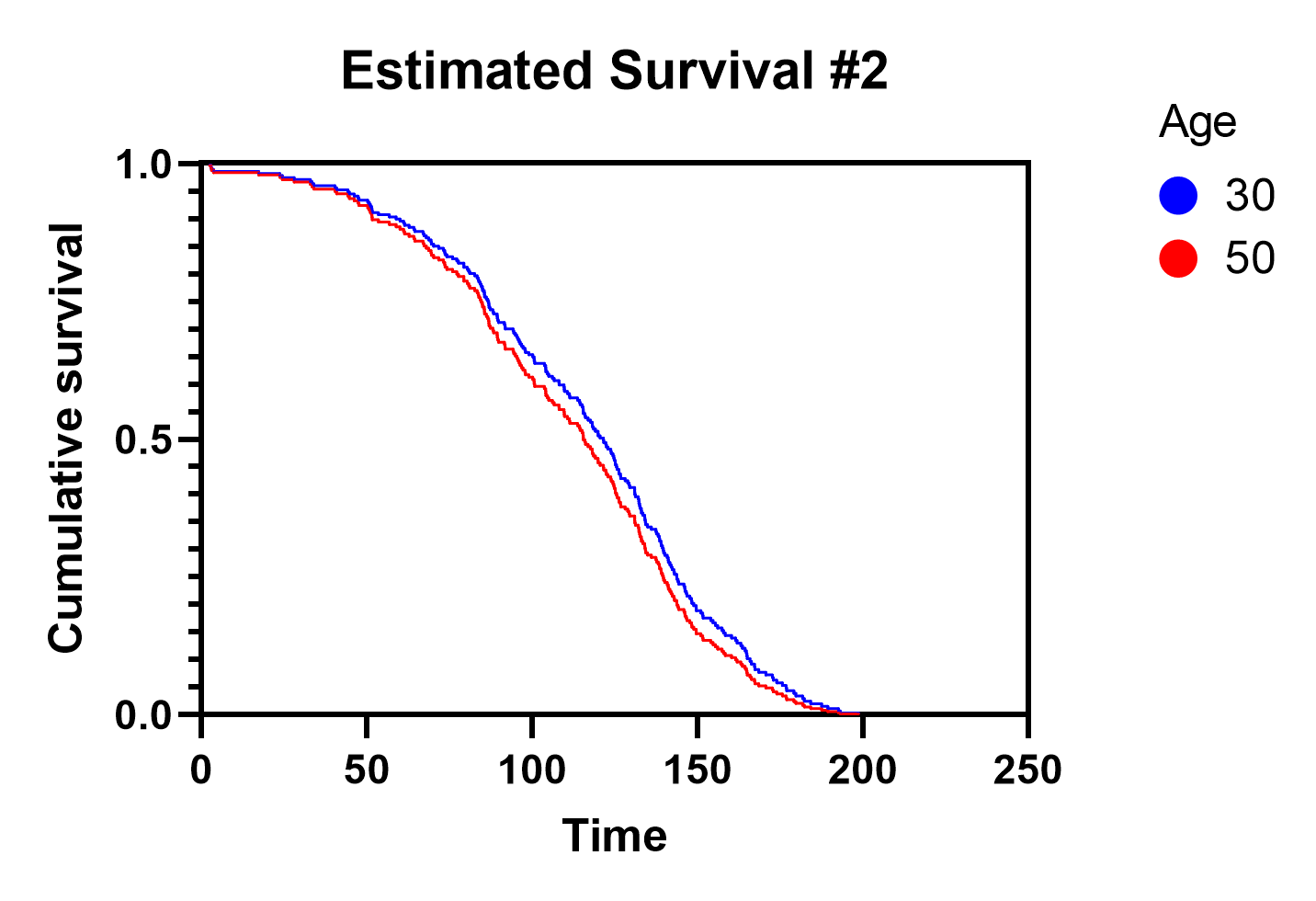 For the second graph, we’ll select “Estimated Survival #2” in the upper box, and then use the dropdown menu to select the variable “Age” in the lower box. Because Age is a continuous variable, we’ll need to enter a value that Prism will use to generate the estimated survival curve. For this graph, we’ll first enter a value of 30. Then, we can use the “Add value” button to create a new input box where we can enter our second value of 50.